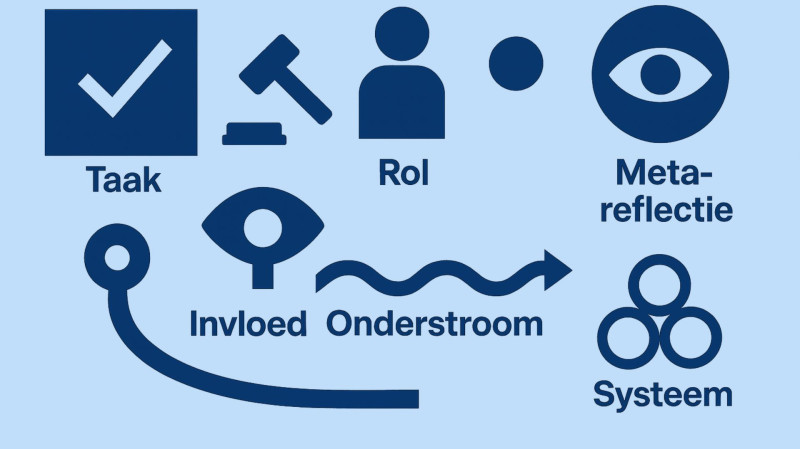 boven situaties uit te stijgen en samen te bekijken wat er gebeurt in taak, rol, grens en macht.