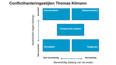 Een eerste stap is herkennen hoe je zelf reageert in conflictsituaties. De conflictstijlen van Thomas Kilmann helpen daarbij. Sommige mensen kiezen voor doordrukken: ze nemen stelling en verdedigen hun eigen belangen krachtig. Anderen geven juist toe om de relatie te aan ieders belang. En er zijn momenten waarop iemand zich terugtrekt, het gesprek uit de weg gaat, afwacht of een compromis zoekt. De meest constructieve manier is echter samenwerken: de belangen van beide kanten onderzoeken en samen een oplossing creëren die waarde toevoegt voor iedereen.